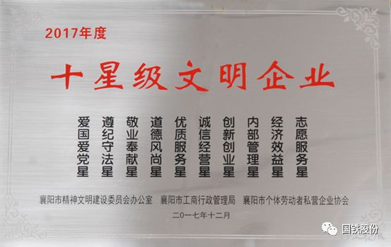 近日,襄陽(yáng)國(guó)鐵榮獲由襄陽(yáng)市精神文明建設(shè)委員會(huì)辦公室、襄陽(yáng)市工商行政管理局、襄陽(yáng)市個(gè)體勞動(dòng)者私營(yíng)企業(yè)協(xié)會(huì)聯(lián)合頒發(fā)的“2017年度十星級(jí)文明企業(yè)”榮譽(yù)稱號(hào)。